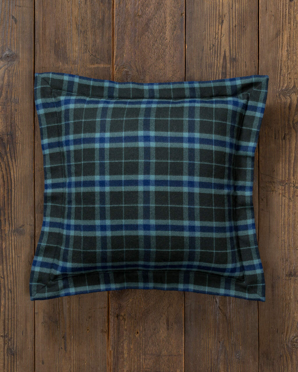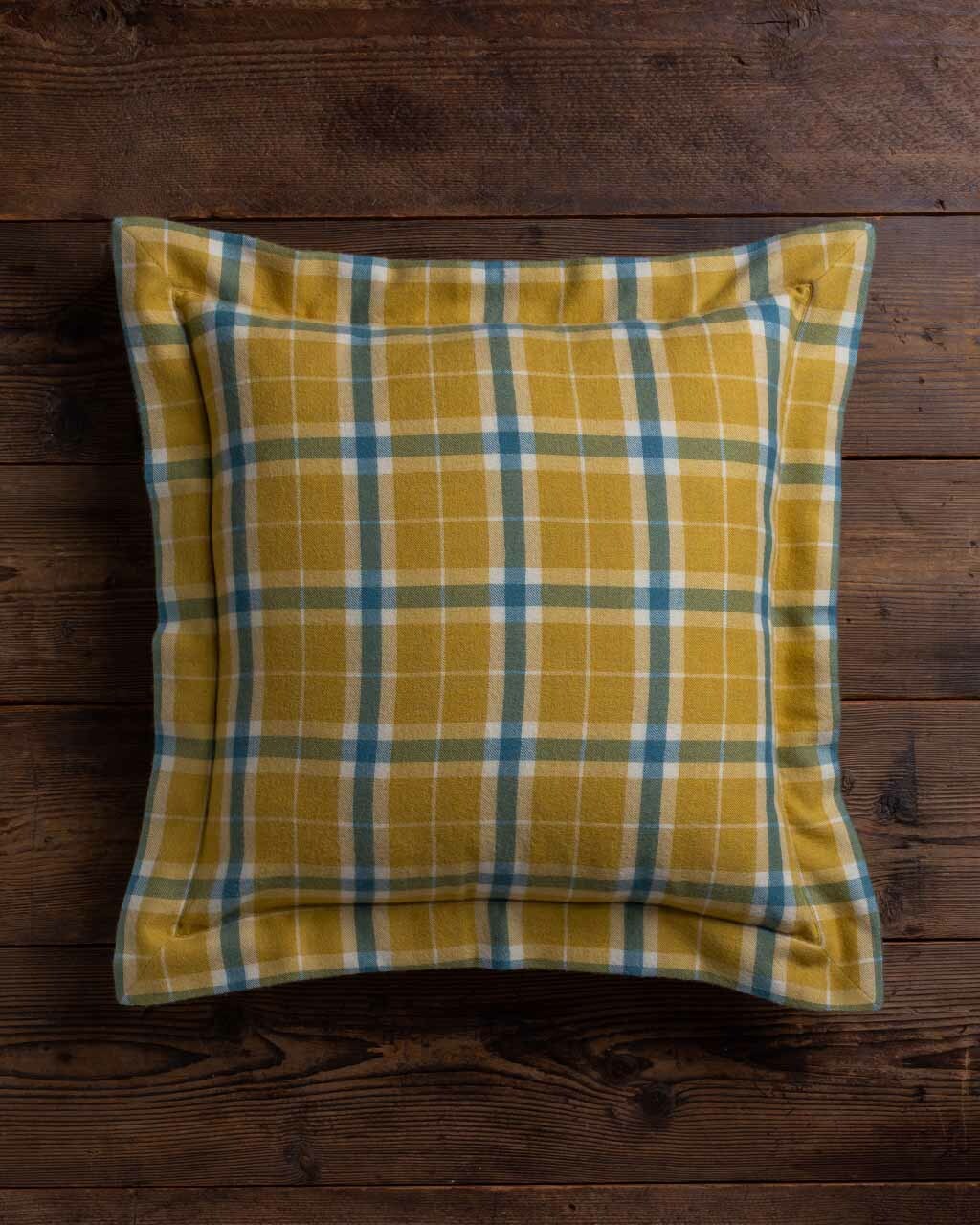 Woven alpaca flannel fabric with plaid pattern square pillow with border comes with alternative down insert.