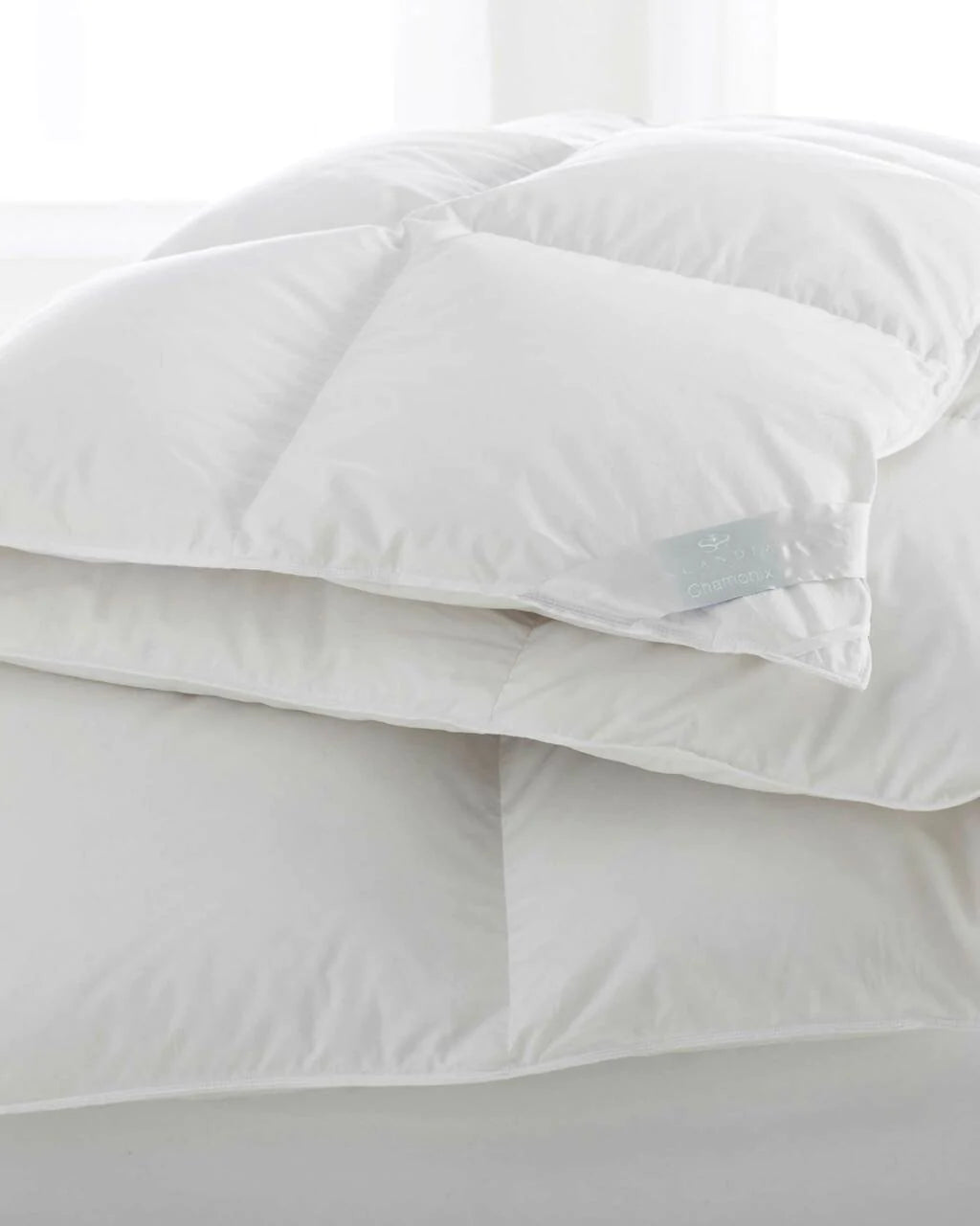 *BRAND NEW* Wrap yourself up in the newest, luxury down comforter from Scandia Home. The Chamonix is filled with 800-850 fill-power Siberian white and enveloped in Scandia Austrian Nano-Sateen shell from one of Germany's finest mills. The result is a finish that is soft, fine, and light to the touch. Handcrafted in the United States, accompanied by a certificate of authenticity and service for a lifetime, the Chamonix comforter is utterly exquisite.