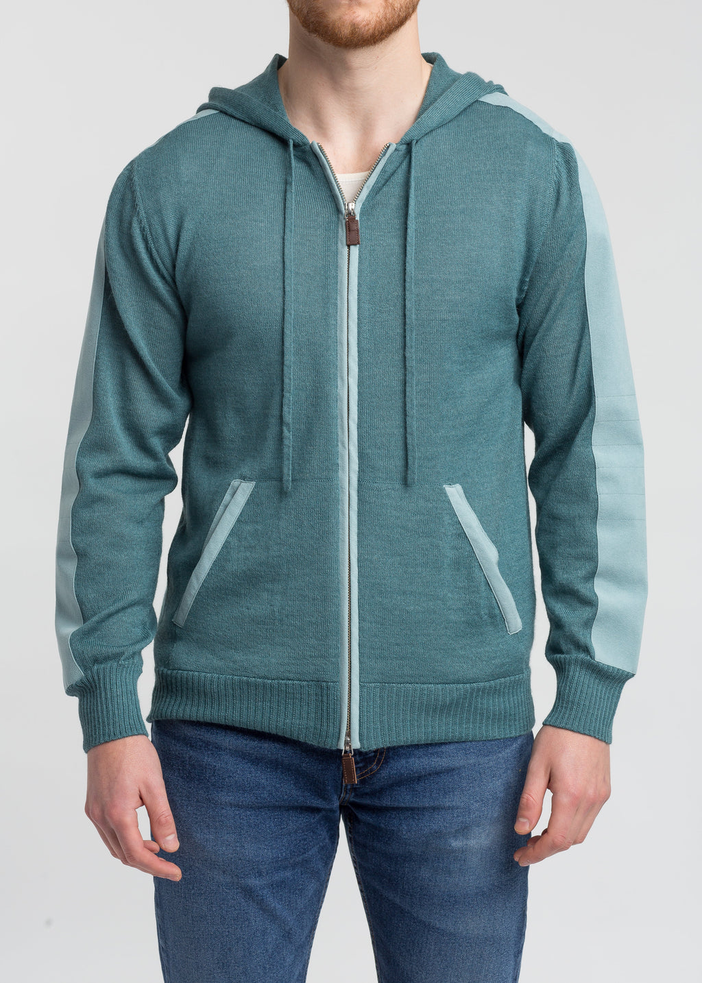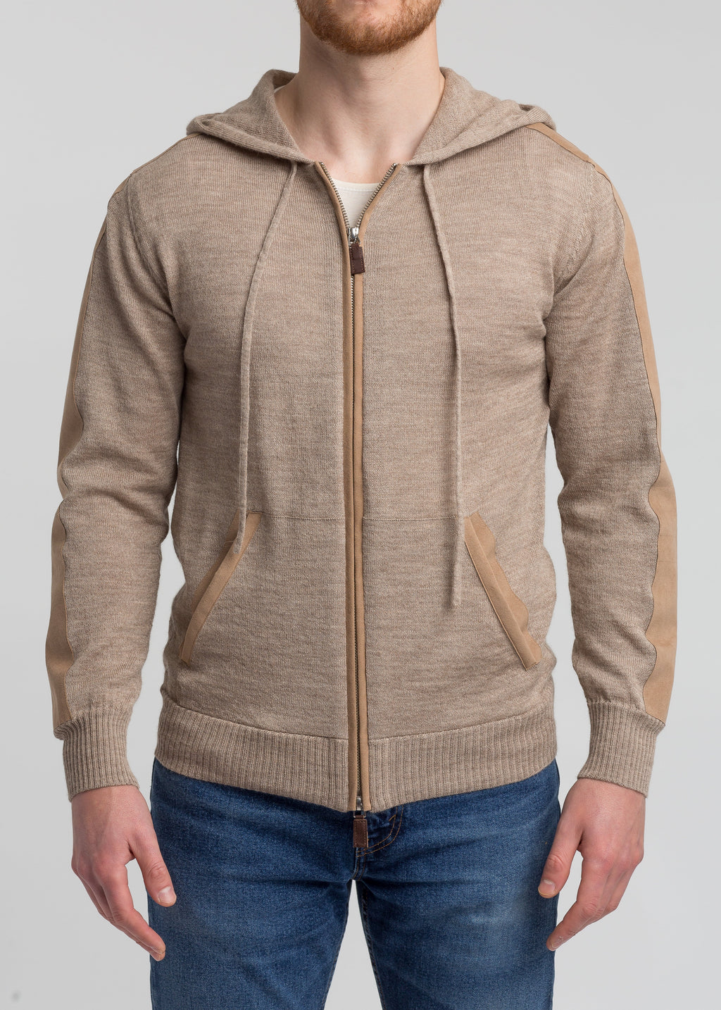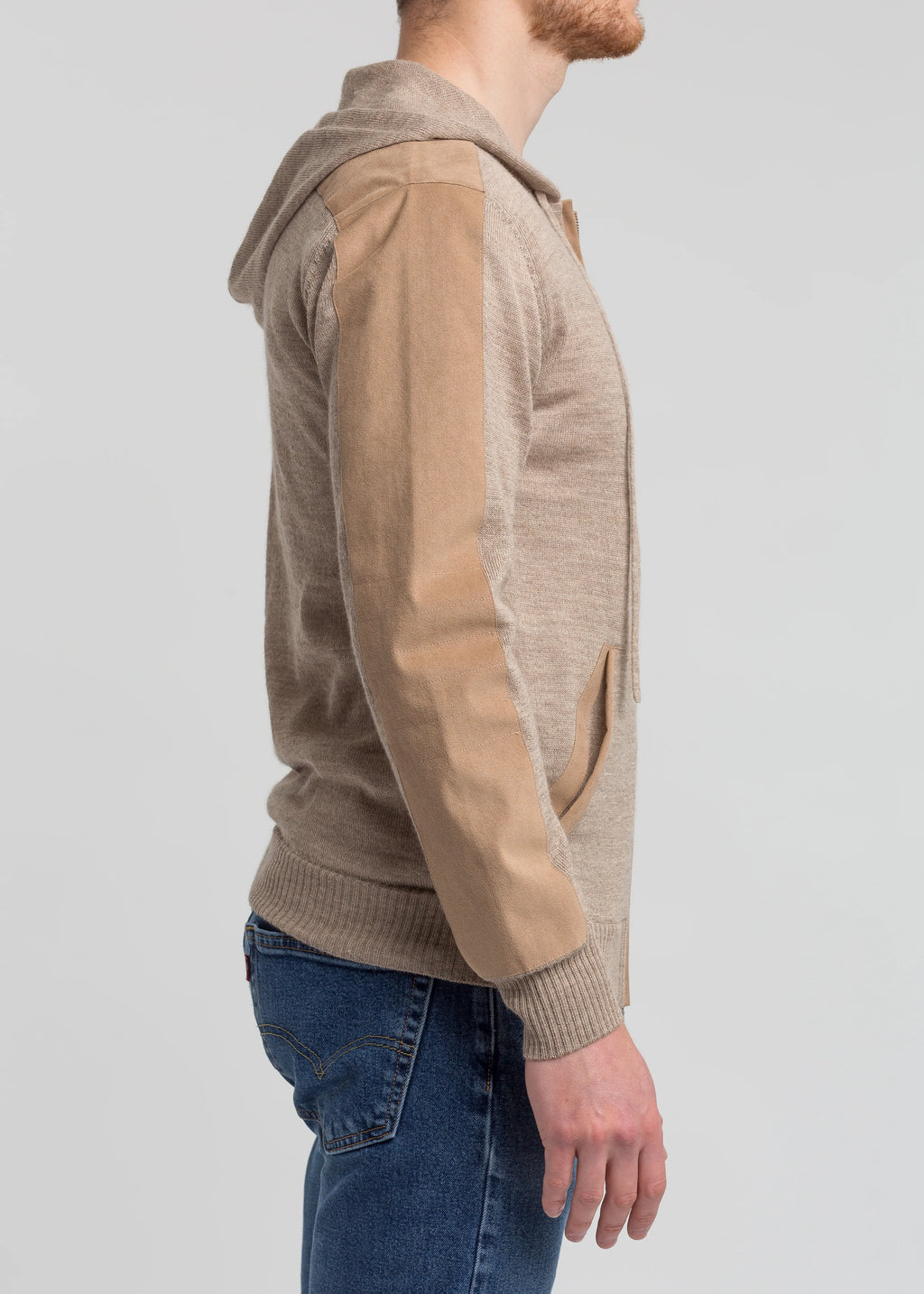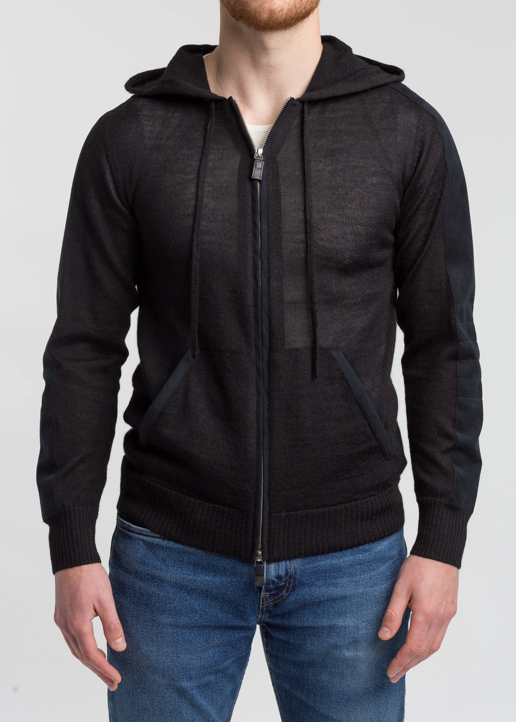 The Damien Hoodie is far more than a basic, it's a necessity. This men's alpaca cardigan is crafted of the softest, breathable baby alpaca/silk blend, it's incredibly soft to the touch. It fares well over a t shirt just as well as a button-down, or under your favorite sportscoat. Unique channel stitch accents are found on the collar, shoulder, and elbow. Alcantara, an unrivaled vegan suede from Italy, offers durability and strength and is 100% carbon neutral. Double zip enclosure, side pockets, zip accents on cuff. Dual outer accent pockets.
