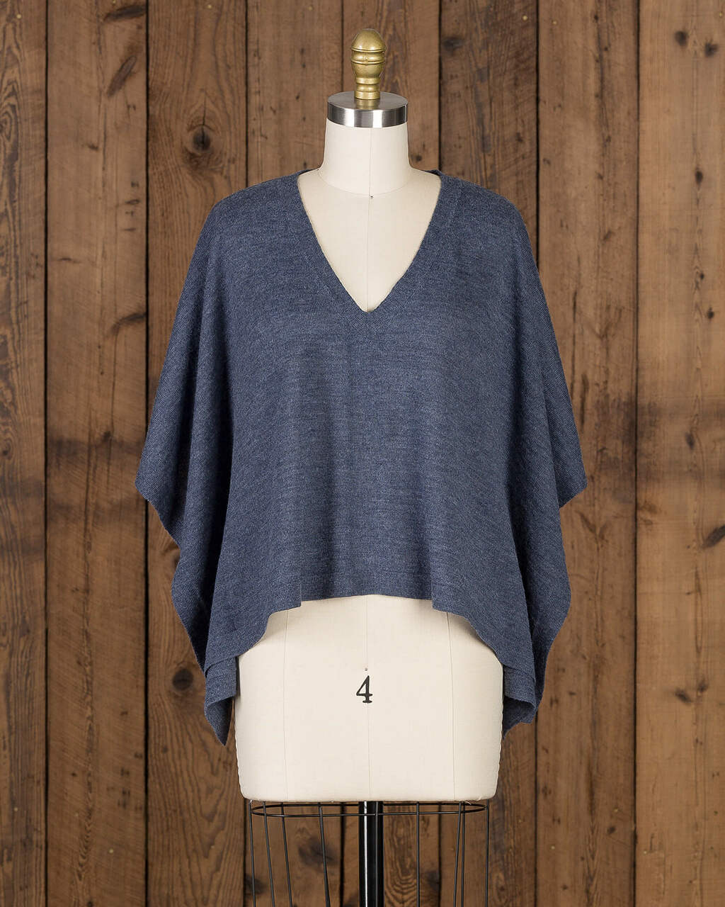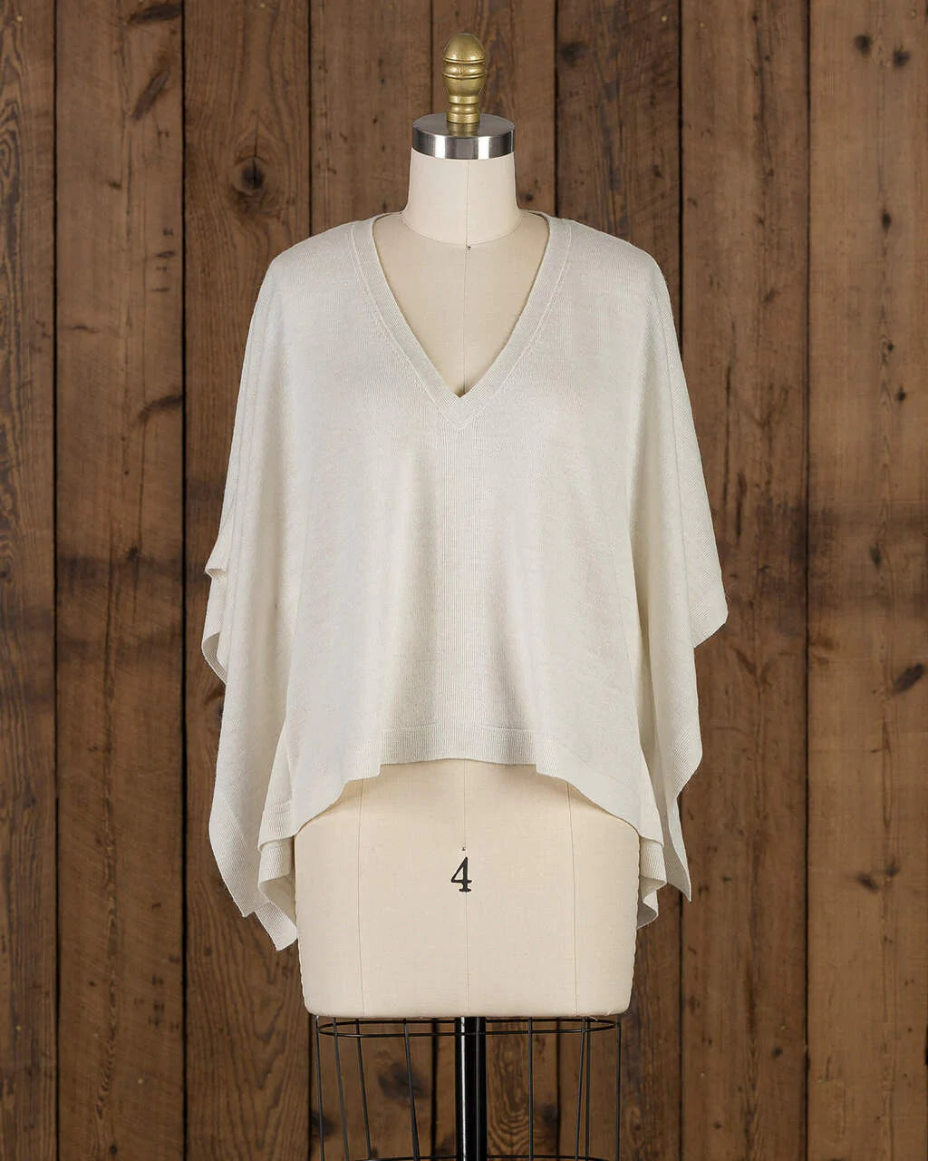 Cropped, lightweght poncho with v-neck. One size with drapey sides/ sleeves.