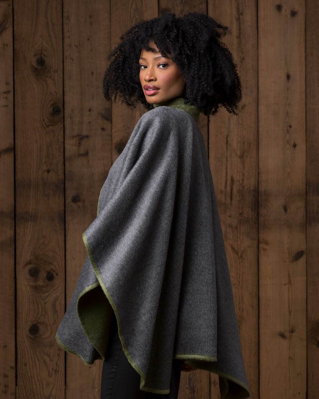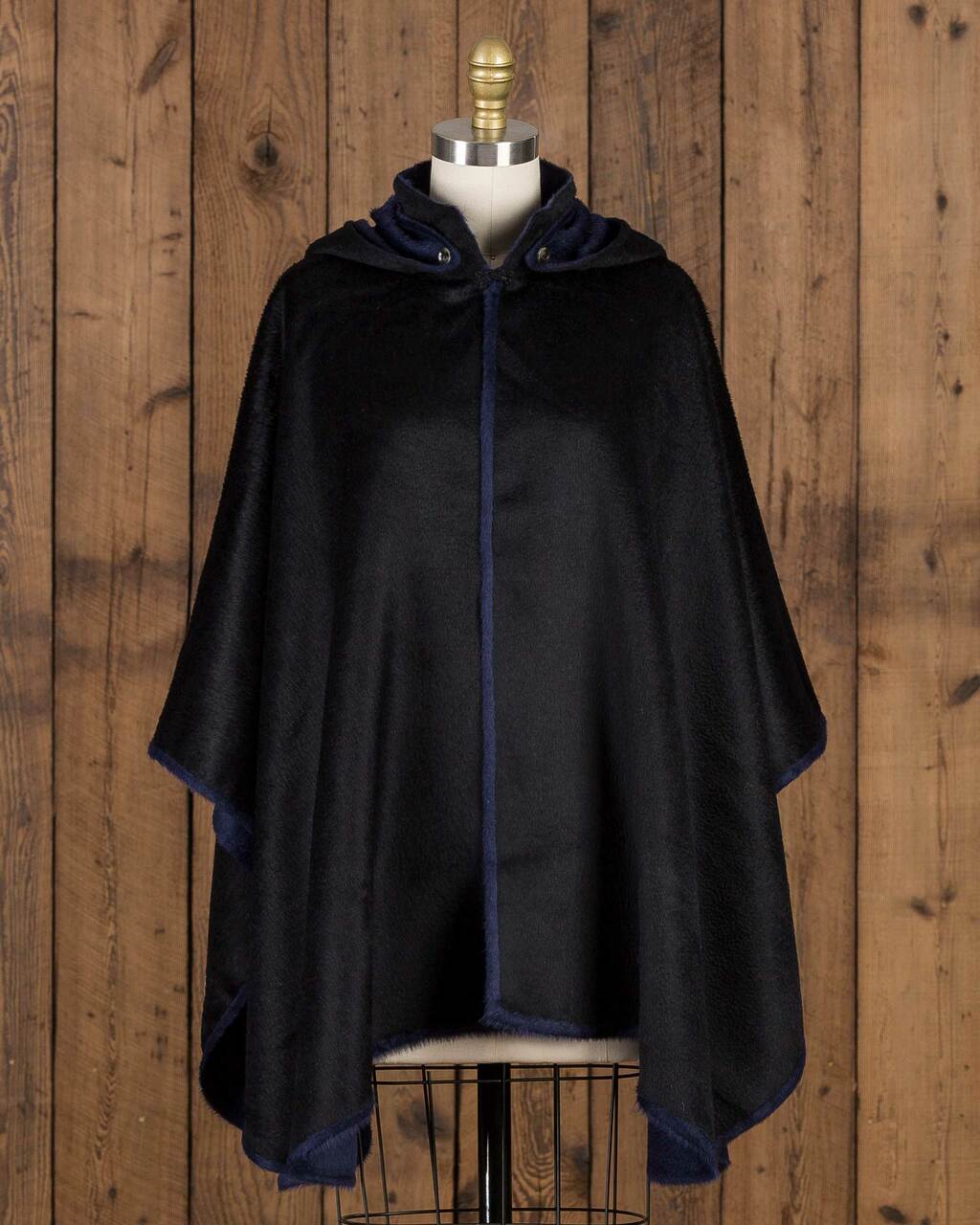 Reversible brushed suri fabric, two toned with hook and eye closure at front collar. Removable hood (with buttons)