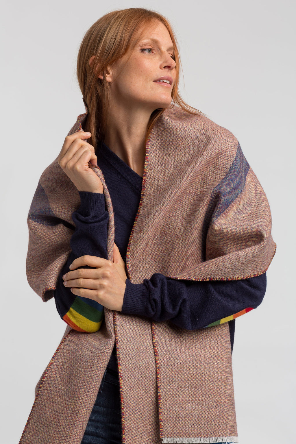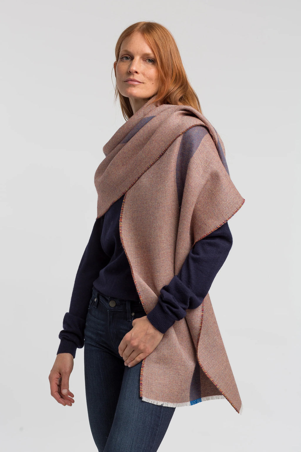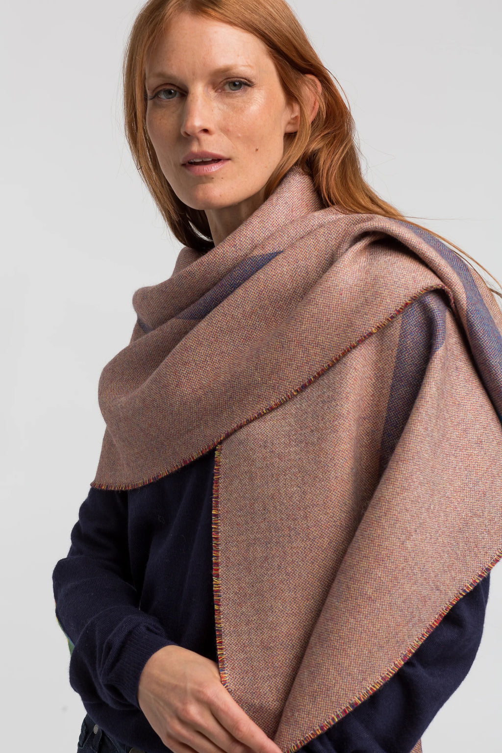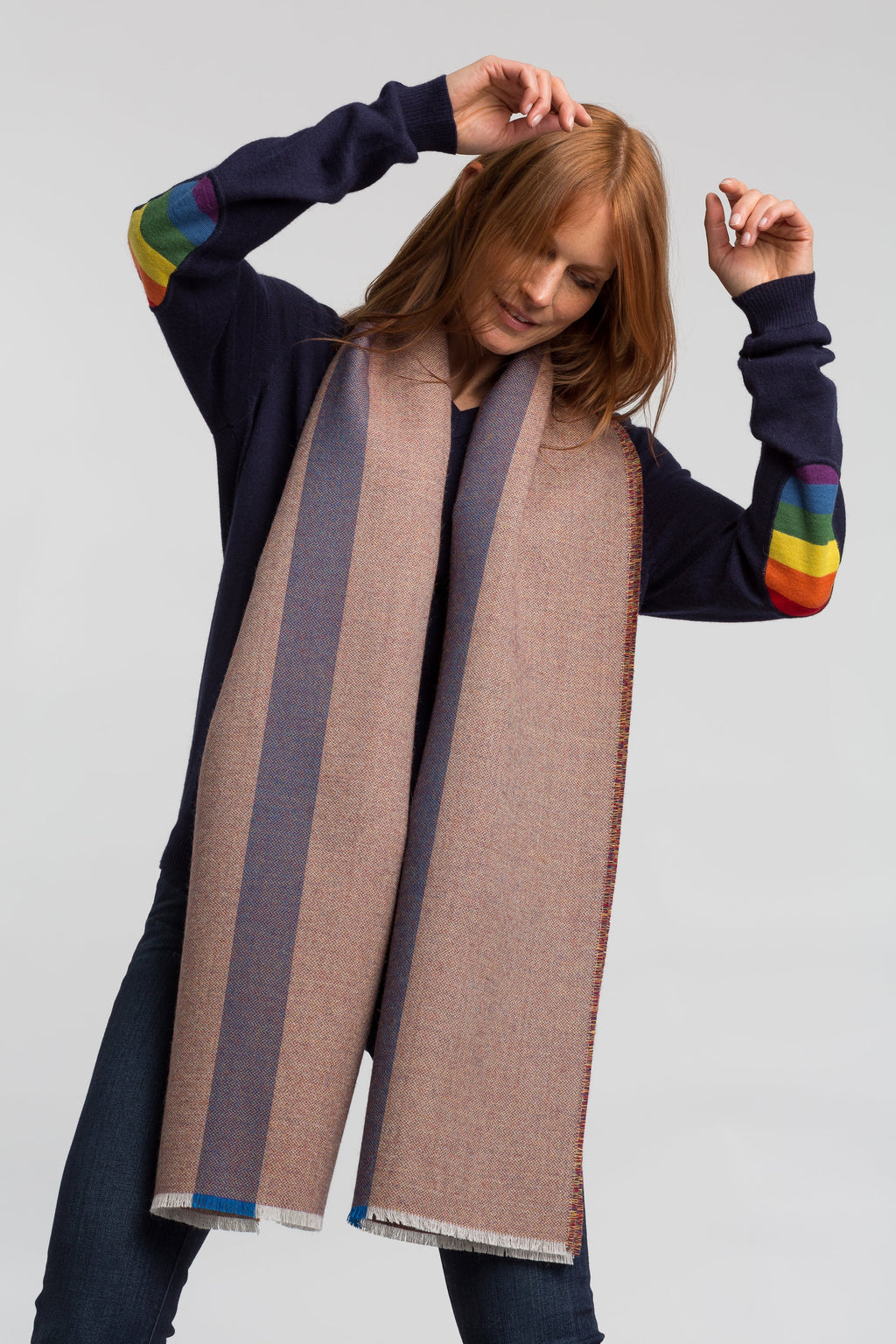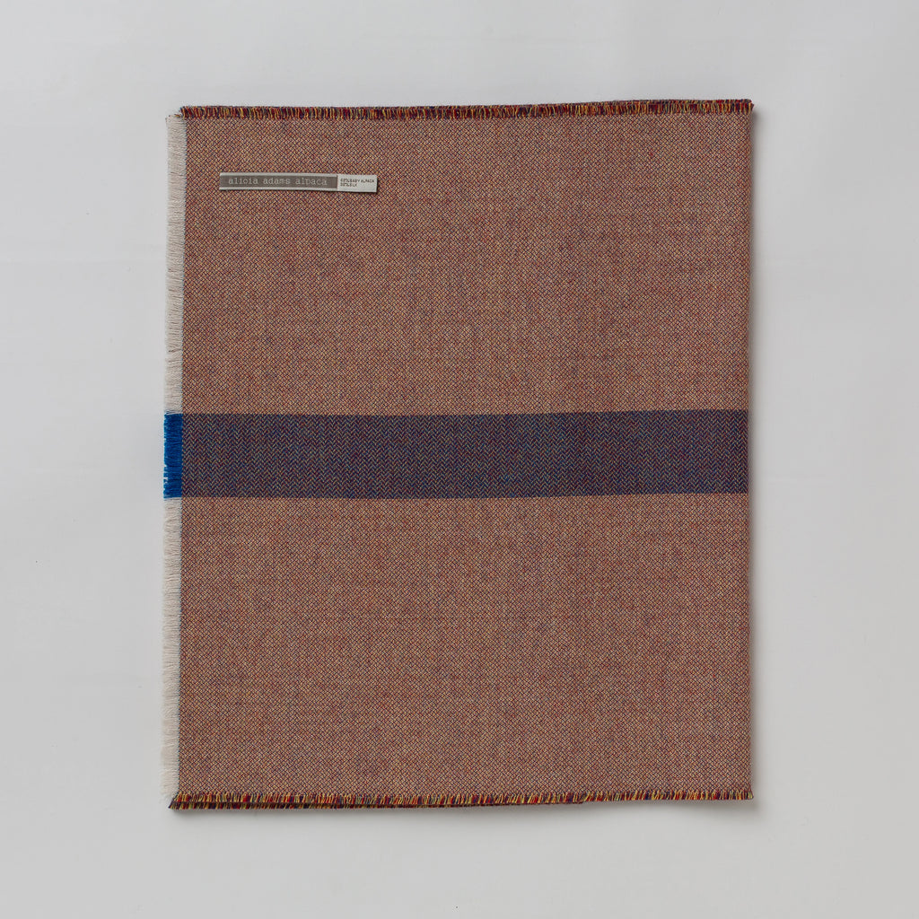 Our Torino Scarf has a blue stripe down the center and is made of a beautiful tri-color tweed weave which gives it a versatile color-way matching many different outfits. It is a thicker woven fabric that will keep you cozy in the winter months and since it is a little wider than a classic scarf, it can also be used as a wrap all year round.