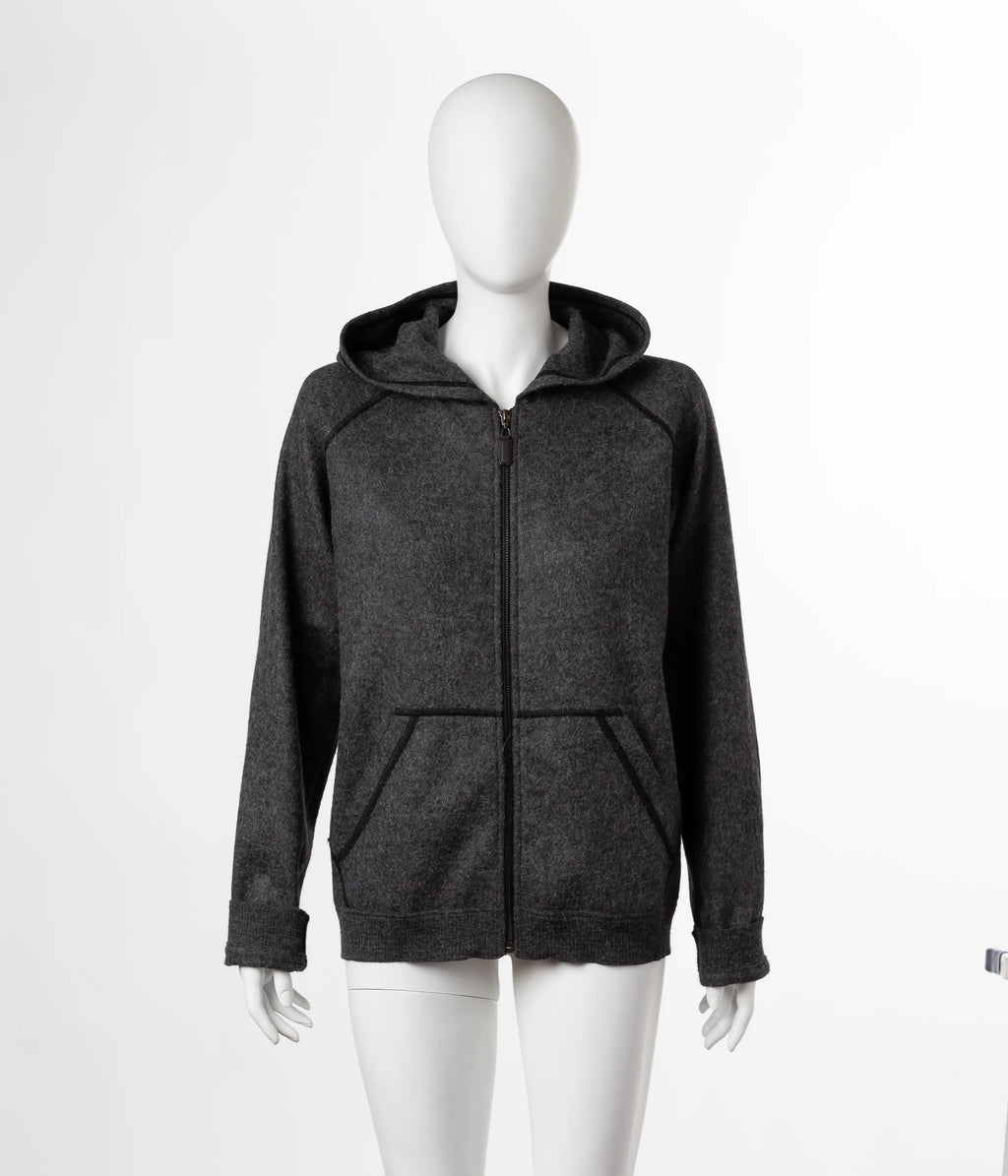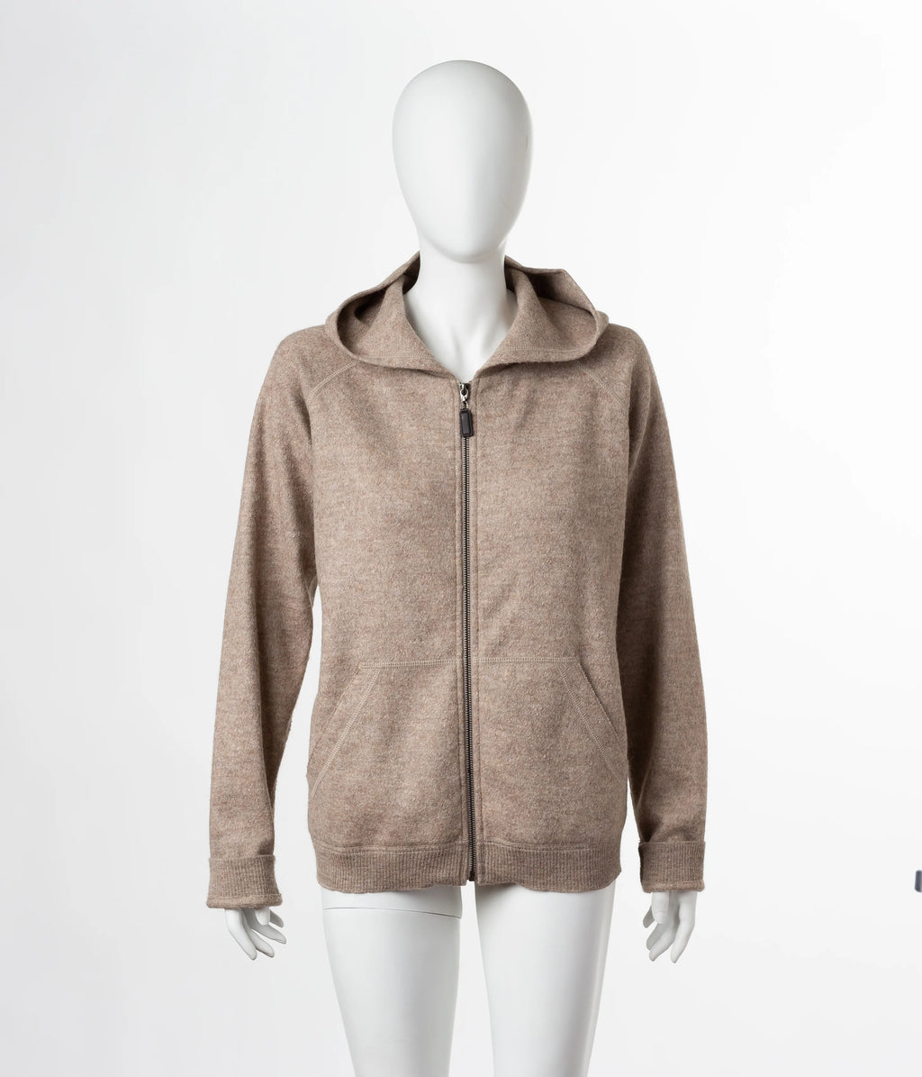This zip up sweatshirt provides an elegant twist to the mundane sweats. High quality craftsmanship and materials result in the perfect "Casual Friday" layering piece, or a hoodie that's nice enough to wear to dinner. Although it's actually unisex, the tailoring is slim and it flatters most frames. It's our favorite women's alpaca hoodie for a casual weekend. Its felted texture is characteristic unique to boiled alpaca wool, the Verbier Zip Up is available in five rich colors each with contrasting elbow pads.
