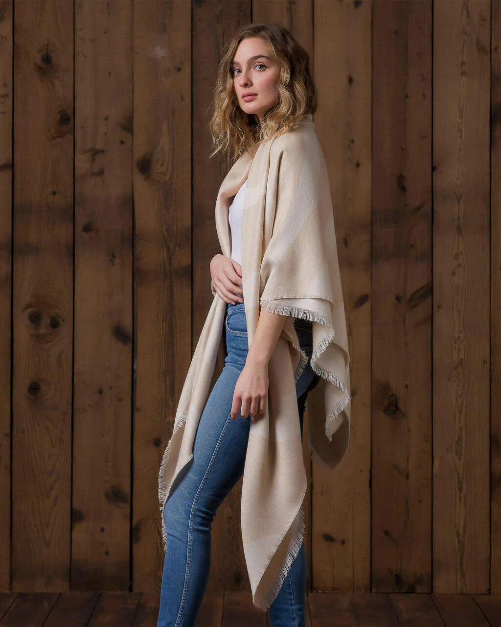 The Zigby Wrap is one of our favorite combinations - baby alpaca + silk. It can be draped around the shoulders or used more like a scarf, depending on your desired aesthetic. This divine blended wrap traps just the right amount of warmth and can be worn with casual and beach attire. It offers a stunning and yet subtle zebra print and a beautiful eyelash fringe.